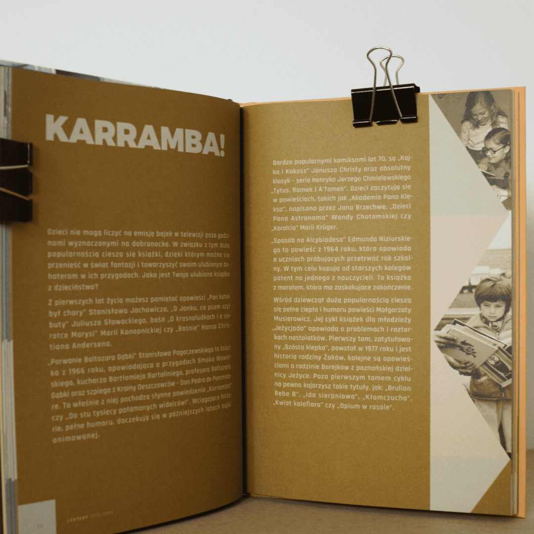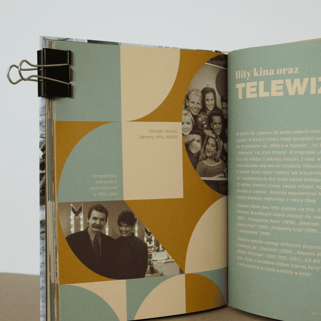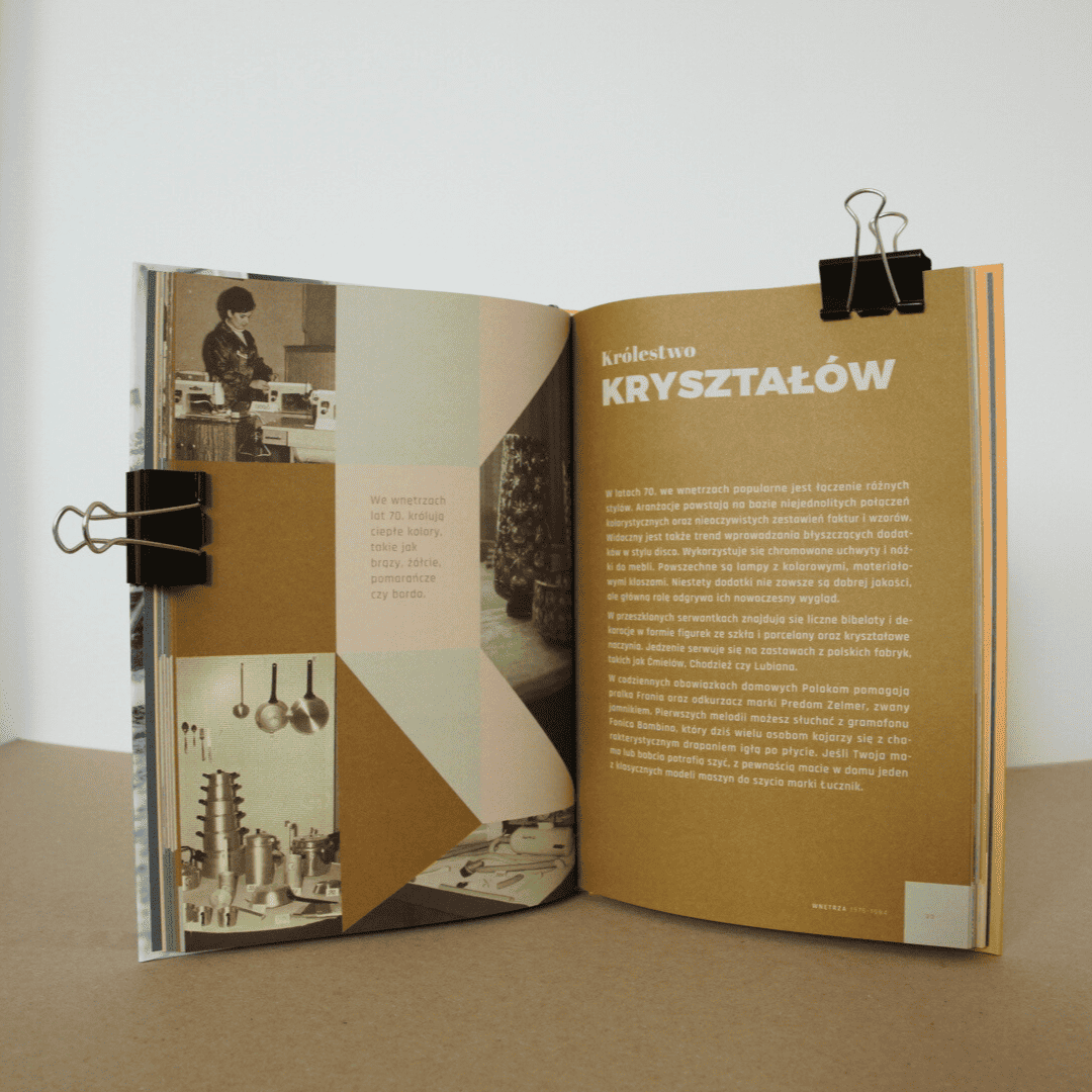 Każdy z rozdziałów książki „1974. Cóż to był za rok!” różni się od kolejnego kolorystyką i patternem/deseniem. Graficy od początku mieli pomysł na użycie w środku publikacji… kratek. Następnie poszerzyli go o dodatkowe kształty i różnorodne zestawienia kolorystyczne, co stworzyło konkretne desenie/patterny nawiązujące mniej więcej do stylistyki danych dekad. Chcieli w ten sposób odróżnić poszczególne dekady od siebie, pokazując jednocześnie ewolucję kultury, wzornictwa i stylistyki. Jednak punktem wyjścia wciąż pozostała kratka (kwadrat). Zastosowanie różnorodnych zestawień kolorystycznych ze stylistyki vintage znacząco wzbogaca odbiór.