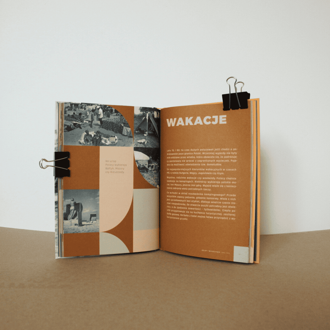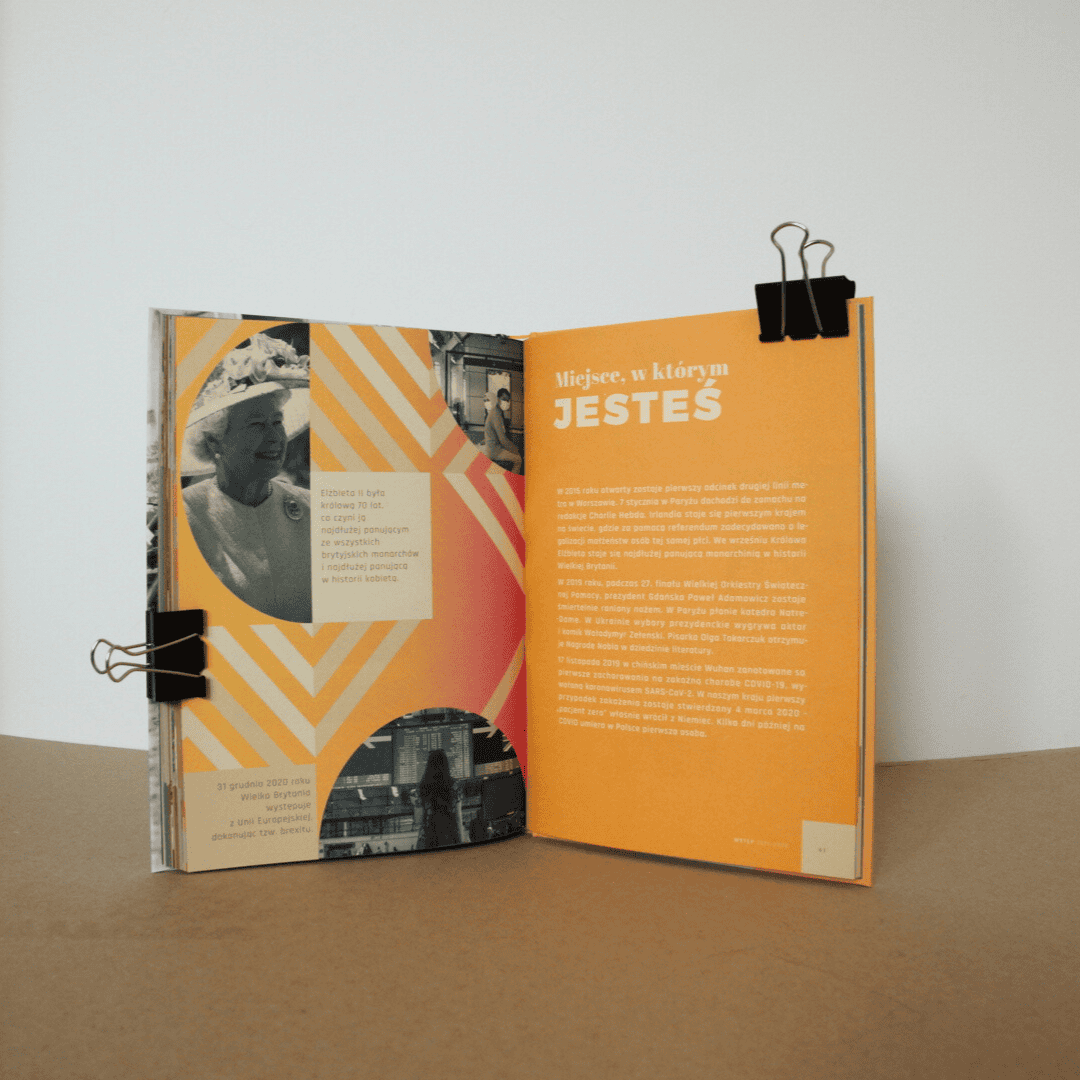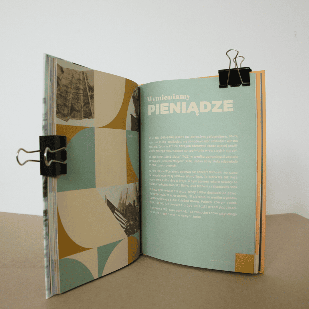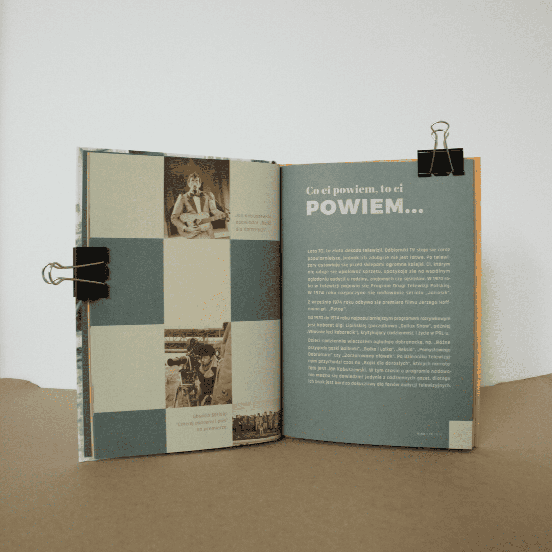 Każdy z rozdziałów książki „1974. Cóż to był za rok!” różni się od kolejnego kolorystyką i patternem/deseniem. Graficy od początku mieli pomysł na użycie w środku publikacji… kratek. Następnie poszerzyli go o dodatkowe kształty i różnorodne zestawienia kolorystyczne, co stworzyło konkretne desenie/patterny nawiązujące mniej więcej do stylistyki danych dekad. Chcieli w ten sposób odróżnić poszczególne dekady od siebie, pokazując jednocześnie ewolucję kultury, wzornictwa i stylistyki. Jednak punktem wyjścia wciąż pozostała kratka (kwadrat). Zastosowanie różnorodnych zestawień kolorystycznych ze stylistyki vintage znacząco wzbogaca odbiór.