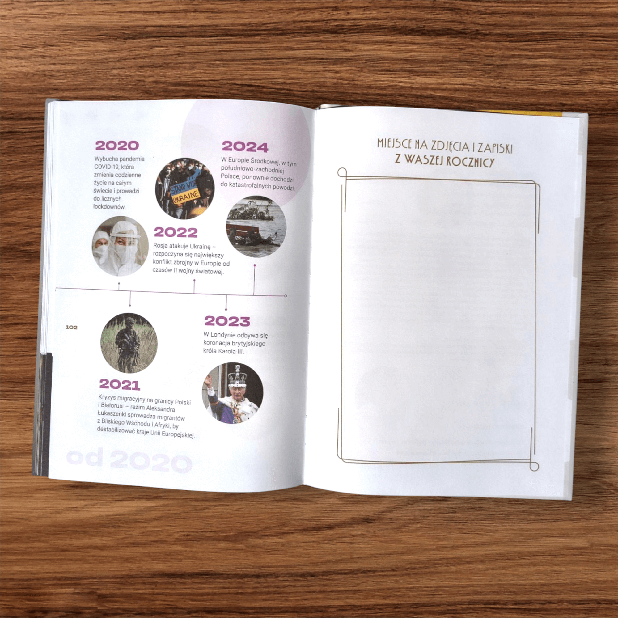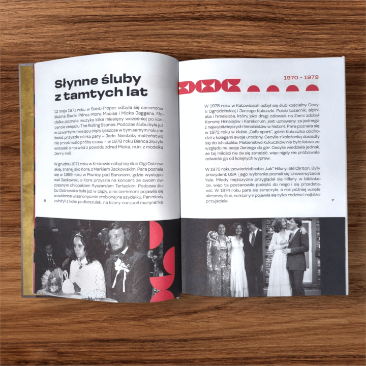Książka „Powiedzieliśmy TAK w latach 70.” to oryginalna i elegancka albumowa kronika, która sprawdzi się jako prezent na rocznicę ślubu, np. na pięćdziesiątą lub każdą inną, jeśli para wzięła ślub w latach 1970-1979.